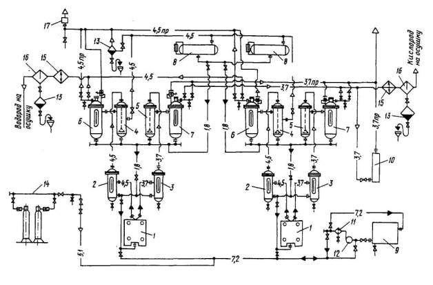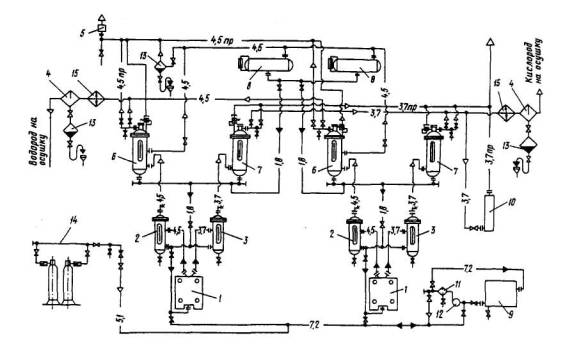 регулятор водорода; 7 - регулятор кислорода; 8 - уравнительный бак; 9 - бак для
