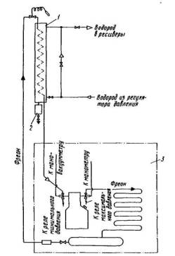 водорода методом охлаждения: 1 - испаритель; 2 - расширитель;