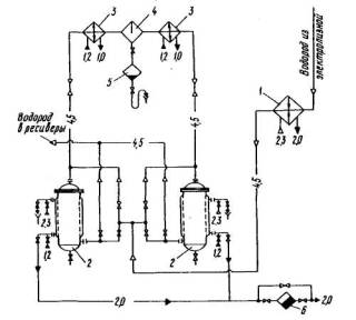 установки осушки водорода: 1 - паровой подогреватель; 2 -