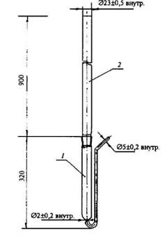 1 - реакционный сосуд; 2 - воздушный холодильник. Рисунок 1 - Прибор для определения антикоррозионных свойств турбинных
