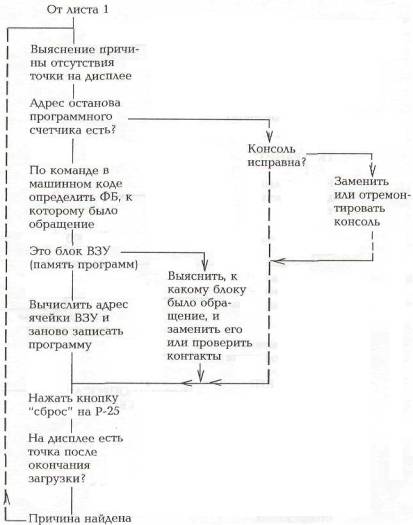Имея в виду вышеуказанные сведения о задачах (их адреса загрузки) после останова системы на каком-либо адресе (на консольном дисплее @ адрес), можно определить, во время выполнения какой именно задачи произошел останов. Далее следует обратиться к адресу, расположенному выше адреса останова на несколько команд, и, читая команды в машинных кодах, определить причину останова. Например, было обращение к какому-либо регистру интерфейсной платы или ВЗУ, а в ответ не последовало ответа. Следовательно, нужно заниматься соответствующей интерфейсной картой и блоком, с которым она связана. Алгоритм поиска причины