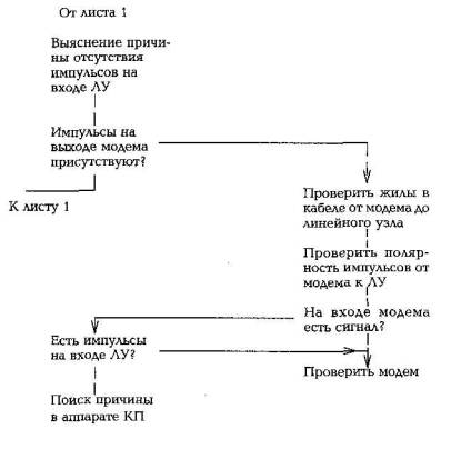 8.5.1. При внешнем осмотре выявляются все дефекты, которые были описаны выше. Правильно работающий интерфейс должен обеспечивать связь ЦП со своим периферийным устройством (включая терминал). Для проверки работы интерфейса после подачи питания контролируется выход комплекса на связь с пультовым терминалом. При отсутствии связи с терминалом наиболее вероятна неисправность канальных приемопередатчиков или внутренних логических схем интерфейса, обеспечивающих их работу. 8.5.2. Проверка интерфейсов сходна с проверкой магистральных шин. Не углубляясь в структуру сигналов, на первых порах необходимо проверить все цепи на "живучесть" (наличие изменяющихся сигналов). Проверку надо начинать с конца, т.е. непосредственно у потребителя интерфейсных сигналов. Линия (цепь), на которой обнаружен постоянный уровень сигнала, подлежит более тщательной проверке. Теперь нужно убедиться в наличии сигналов на выходе из источника. По возможности нужно отключить нагрузки, чтобы исключить их шунтирующее действие. Если сигналы на выходе есть, то нужно двигаться по линии, контролируя их прохождение. При отсутствии сигналов без нагрузки необходимо изменить направление обследования и проверить цепи управления источника. 8.5.3. Наиболее частые случаи повреждения интерфейсов: плохие пайки плоских жгутов