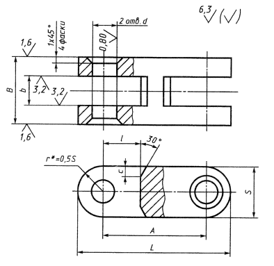 обозначения двухпазовой серьги размерами А = 32 мм, b = 10 мм, с полем допуска диаметра d - Н7: Серьга 7018-0551 Н7 ГОСТ 12478-67 (Измененная редакция, Изм. № 1, 2). 2. Материал - сталь марки 45
