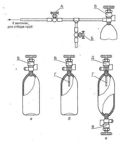 а - контейнер с одним вентилем; б - контейнер со сливной трубкой; в - контейнер с двумя вентилями; А - регулирующий вентиль; Б - продувочный вентиль; В - впускной вентиль; Г - сливная трубка; Д - выпускной вентиль Рисунок А. 1 - Контейнеры для проб и пробоотборная линия ПРИЛОЖЕНИЕ Б