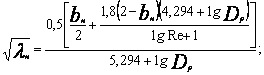 где lн — коэффициент сопротивления трения по длине напорного трубопровода; vср — средняя скорость течения жидкости, м/с; g — ускорение свободного падения, м2/с; Dp — расчетный диаметр трубопровода, м, равный: Dp = 0,5 (2Dн + DDн – 4S – 2DS); Dн — наружный диаметр трубопровода, м; DDн — допуск на наружный диаметр трубопровода, м; S —толщина стенки трубы, м; DS — допуск на толщину стенки трубы, м; bн — число подобия режимов течения жидкости;