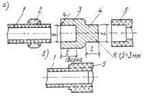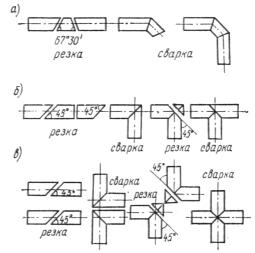 9.2. Фасонные части для труб из ПВП, ПНП и ПП следует изготовлять контактной стыковой сваркой, а для труб из ПВХ — газовой прутковой сваркой. 9.3. Технология изготовления отводов, колен, тройников и крестовин для труб из ПВП, ПНП и ПП контактной стыковой сваркой включает следующие операции (рис. 22): резку труб на заготовки; очистку концов труб от загрязнений и торцовку; сварку (отводов и колен); отрезку вершины угольника (для тройников и крестовин); сварку (тройников и крестовин); 9.4. Для изготовления фасонных частей контактной стыковой сваркой следует применять специальное оборудование и приспособления, обеспечивающие правильное взаимное расположение деталей, при этом должны соблюдаться требования, изложенные в п. 8.3. Для торцовки следует использовать двустороннюю фрезу, снабженную сменными резцами. 9.5. При изготовлении тройников и