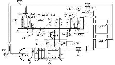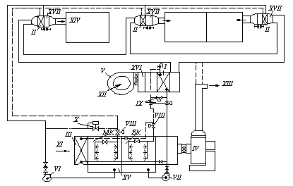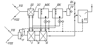 соответственно циркуляционные насосы малого и большого контуров циркуляции; VIII – воздушные заслонки; IX – насос для