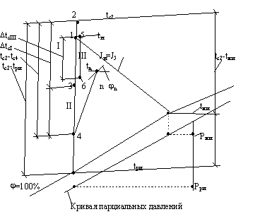 состояние воздуха при его обработке в испарительном кондиционере; I, II,