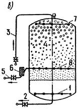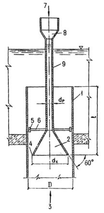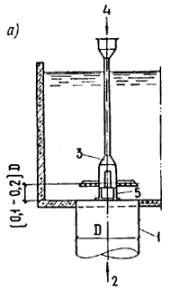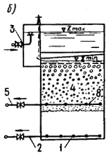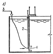 перфорированного распределителя коагулянта (тип I) а - в вихревом смесителе; б - в перегородчатом или коридорном смесителе, входной камере контактного осветлителя; 1 - распределитель; 2 - секционная свинчивающаяся штанга; 3 - подача коагулянта; 4 - зарядка сифона 1.2. Потери напора при обтекании