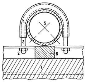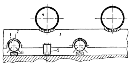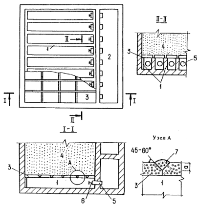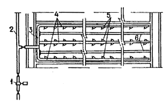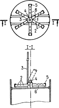 распределитель коагулянта (тип I) 1 - центральный бачок; 2 - отверстия для ввода коагулянта; 3 - разъемная штанга; 4 - штуцер для присоединения шланга подачи коагулянта; 5 - заглушка; 6 - перфорированная трубка-луч 1.6. Число отверстий в распределителе следует определять по расходу
