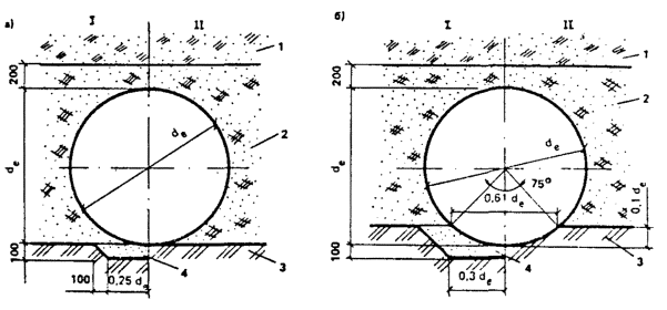 песчаной подушкой; II - без песчаной подушки; 1 - засыпка местным грунтом