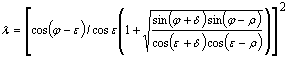 cos(e + d +w)(1 + = cos2(21° - 22° -3°)cos(22°+0°)/cos3° cos222°