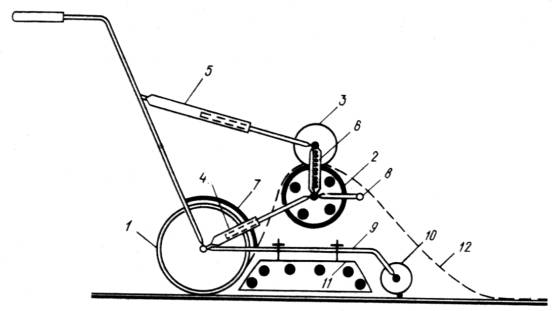 контактного электроразогрева 1 - каток; 2 - нагревающий цилиндр; 3 - прижимной валик; 4 - телескопическая опорная рама нагревающего цилиндра; 5 - телескопическая тяга прижимного валика; 6 - устройство для установки рабочего положения прижимного валика; 7 - устройство для фиксирования положения рамы нагревающего цилиндра; 8 - рукоятка вращения нагревающего цилиндра; 9 - рама нагревателя основания; 10 - направляющее колесо; 11 - съемный нагреватель основания; 12 - полотнище рулонного материала. 3.2. Для защитного слоя