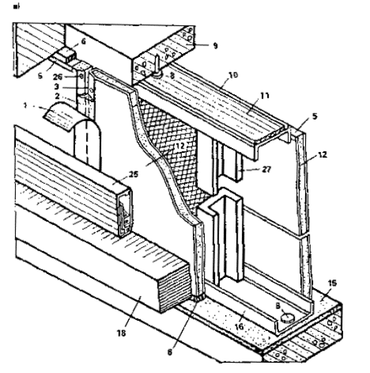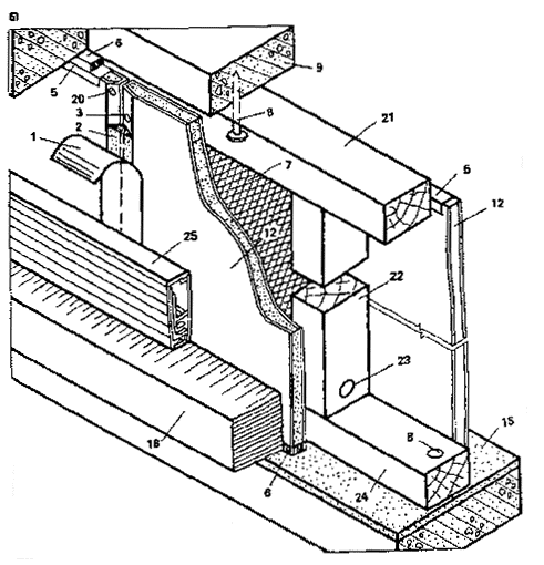 24 - верхние и нижние направляющие деревянные (бруски 40´50); 22 - стойки деревянные (бруски 40´50); 23 - гвоздь, для крепления стойки; 25 - плинтус