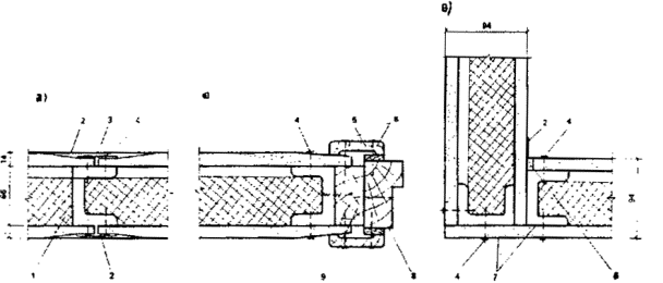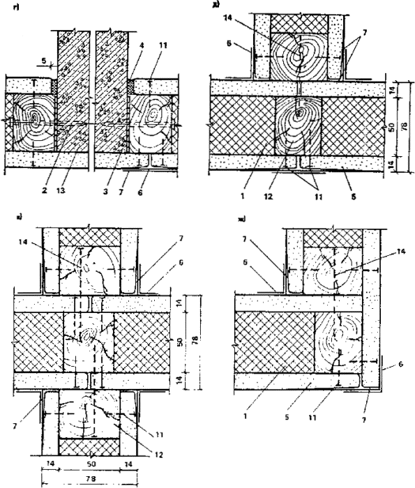 пересечение перегородок; ж) угол перегородки 1 – стойка; 2 -