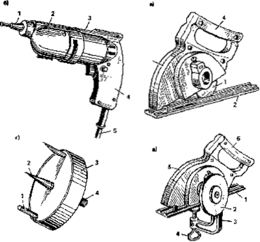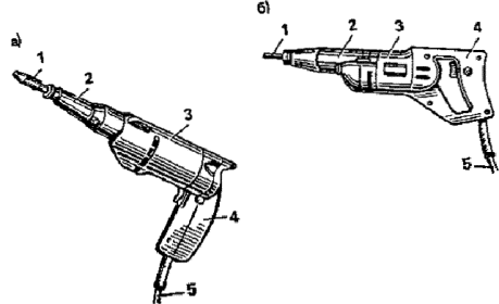 5 - винт стопорный; 6 - направляющая задней опоры Рис. 59. Шуруповерты ручные электрические; а) ИЭ-3601Б; б) ИЭ-3602А 1 - отвертка; 2 -