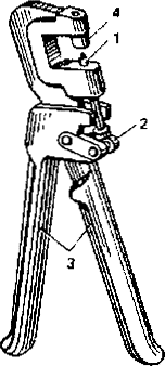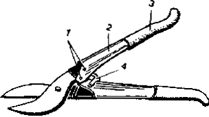 ролик толкающий; 3 - ручки; 4 - направляющая матрица Рис. 53. Ножницы ручные двухшарнирные 1 - оси; 2 - ручка; 3