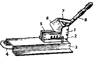 5 - матрица; 6 - нож; 7 - рычаг; 8 - рукоятка Рис. 56. Уровень магнитный Рис. 57. Отвес магнитный Рис. 58. Станок для распиловки брусков 1 -