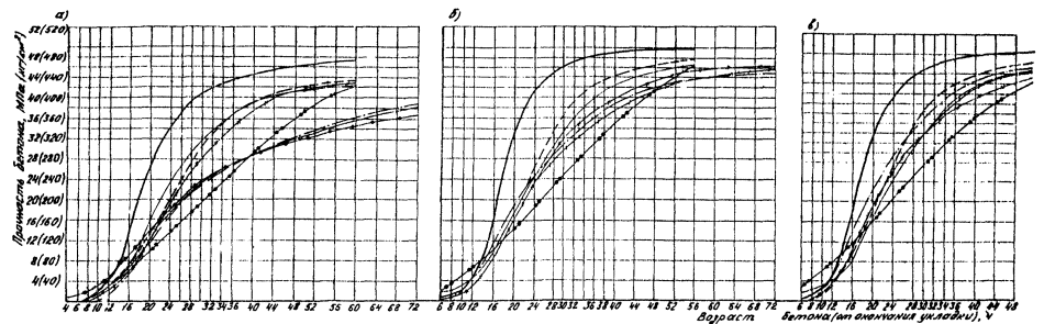 кинетики изменения прочности бетонов классов В35 (а), В40 (б) и В45 (в) для