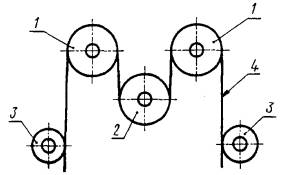 редуктор натяжного устройства 1 - подвижные стержни; 2 - неподвижные стержни; 3 - опорные ролики;
