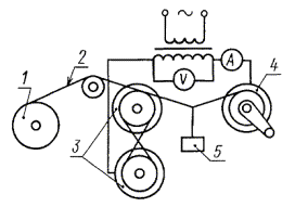 зажим; 3 - образец провода; 4 - груз; 5 - электродвигатель В установку входит электрод, состоящий из