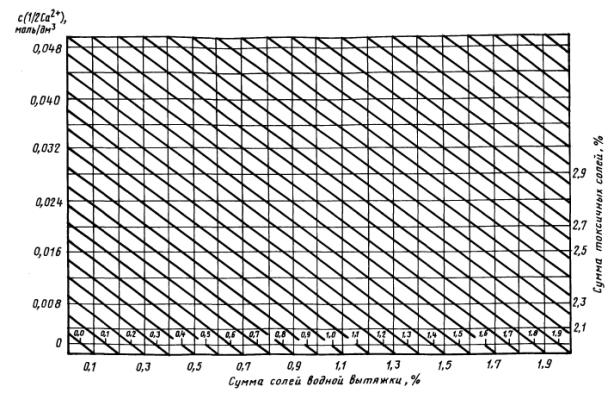 SO42-, которые в этом случае связываются с кальцием. Номограмма для расчета суммы токсичных солей по водным вытяжкам