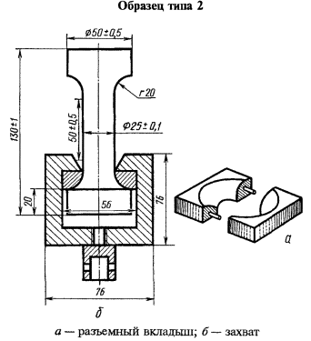 Изм. № 1). 3. ПРОВЕДЕНИЕ ИСПЫТАНИЯ3.1. Испытание проводят при скорости раздвижения захватов испытательной машины (5 ± 1) мм/мин. 3.2. Перед испытанием на образцы наносят симметрично метки, ограничивающие рабочую часть (базу для измерения деформации), равную (50 ± 0,5) мм. Нанесение меток не должно приводить к изменению свойств материала и к его разрушению по меткам. 3.3. В соответствии с ГОСТ 25015 толщину и ширину образцов измеряют в трех местах по длине рабочей части; в середине и на расстоянии 5 мм от меток. Из полученных значений вычисляют среднее арифметическое, по которому определяют начальное поперечное сечение. 3.1 - 3.3. (Измененная редакция, Изм. № 1). 3.4. Испытание образцов типов 2 и 3 проводят с помощью специальных зажимных приспособлений (черт. 2 и 3). 3.5. На образце, закрепленном в захватах, устанавливают прибор для измерения деформации по п. 1.4. 3.6. В процессе растяжения записывают диаграмму «нагрузка - деформация» вплоть до разрушения образца. 3.7. В расчет принимают результаты, полученные на образцах, разрушившихся в пределах рабочей части. 4. ОБРАБОТКА РЕЗУЛЬТАТОВ4.1. Из диаграммы «нагрузка - деформация» определяют максимальное усиление (Рmax), развиваемое в процессе растяжения, и разрушающее усилие (Рразр) в момент разрыва образца в Н (кгс). 4.2. Максимальное напряжение (σmax) при растяжении и разрушающее напряжение (σразр) в МПа (кгс/см2) вычисляют по формулам: