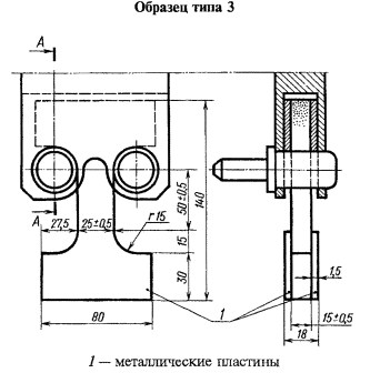 Черт. 2. Черт. 3. 2.2. Образец типа 2 допускается применять для испытания ячеистых пластмасс, толщина которых более 50 мм. 2.1, 2.2. (Измененная редакция, Изм. № 1). 2.3. Образец типа 3 применяют в тех случаях, когда при закреплении образцов типов 1 и 2 в зажимах происходит разрушение ячеистой структуры пластмассы. 2.4. Образцы типов 1 и 3 изготовляют из заготовки механической обработки на фрезерном станке, типа 2 - на токарном станке так, чтобы продольная ось была перпендикулярна к направлению вспенивания материала. Вырезка образцов из заготовки в другом направлении оговаривается особо. 2.5. Образцы типа 3 испытывают с применением усиливающих металлических пластин, формы и размеры которых указаны на черт. 3. Для этого к каждому образцу перед испытанием приклеивают четыре металлические пластины. Рекомендуется использовать металлические пластины из алюминиевых сплавов или алюминия. Клей, применяемый для приклеивания металлических пластин к образцу, должен быть таким, чтобы предел прочности при сдвиге клеевого шва был больше предела прочности при сдвиге ячеистого материала. Клей не должен влиять на свойства материала. Рекомендуется использовать клей на основе эпоксидной смолы. 2.6. Образцы должны иметь ровную поверхность без видимых дефектов ячеистой структуры и механической обработки. 2.7. Количество образцов, взятых для испытаний, должно быть не менее пяти. 2.8. Перед испытанием образцы кондиционируют по ГОСТ 12423 в течение 24 ч при (23 ± 2) °С, если в стандартах и технических условиях на материал нет иных указаний. (Измененная редакция,