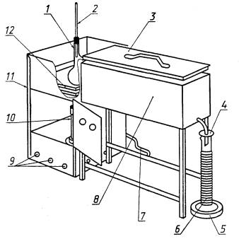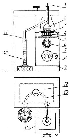 перегонки; 2 - термометр; 3 - крышка бани; 4 - фильтровальная бумага; 5 - подставка; 6 - мерный цилиндр; 7 - газопровод; 8 - охлаждающая баня; 9 - вентиляционные отверстия;