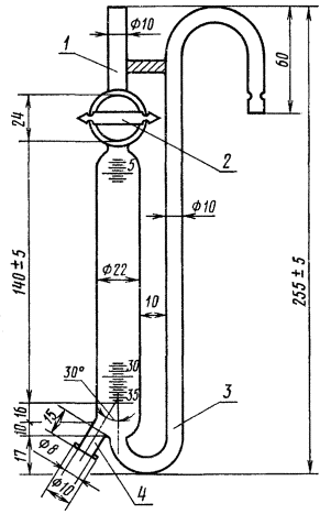 диаметром 4 - 4,5 и 8 мм; глицерин обезвоженный по ГОСТ 6259; кальций хлористый; ацетон по ГОСТ 2603; воду дистиллированную по ГОСТ 6709; Паровая бюретка 1 - верхний отвод; 2 - запорный краник с отверстием 2 мм; 3 -
