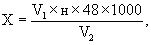 раствора титранта, израсходованный на титрование, см3; н - нормальность раствора титранта; 48 - грамм-эквивалент сульфат-иона; V2 - объем