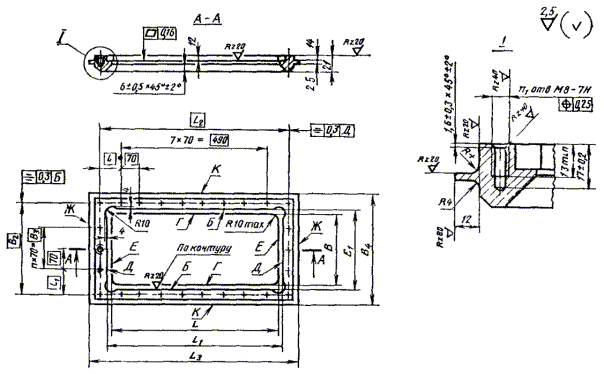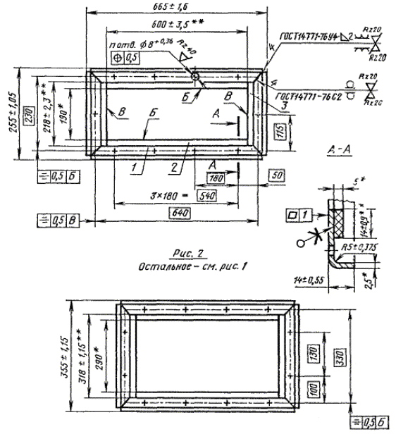 должны соответствовать указанным на черт. 6-12 и в табл. 7-9. ___________ * Размеры для справок. ** Размеры между уголками. 1 - прижимная рамка; 2 -