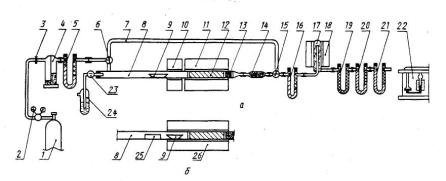 гидроксила лития с аскаритом; 3 - оксид фосфора (V) и кусочки стекла; 4 - U-образная трубка; 5 - склянка для подсчета пузырьков. 6 - капилляр диаметром 1 - 1,5 мм; 7 - вазелиновое масло: 8 - кварцевая