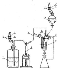 где m4 - масса навески бензойной кислоты, г; V - объем раствора метоксида натрия, израсходованный на титрование, см3. 6.2. АппаратураПринципиальная схема установки для определения кислорода полумикрометодом приведена на рисунке 5. Вся аппаратура в установке должна соединяться с помощью шлифов кроме приборов для поглощения диоксида углерода. 6.2.1. Устройство для очистки азота. Типичное устройство для очистки азота (рисунок 6) состоит из следующих частей. 6.2.1.1. Регулятор давления, содержащий