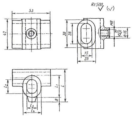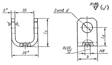(Измененная редакция, Изм. № 2). Пример условного обозначения стержня длиной l = 350 мм из стали марки Ст3кп: Стержень 350 ГОСТ 24199-80 То же, из стали марки Ст3сп: Стержень 350-С ГОСТ 24199-80 4. Конструкция и основные размеры ползунка и скобы должны