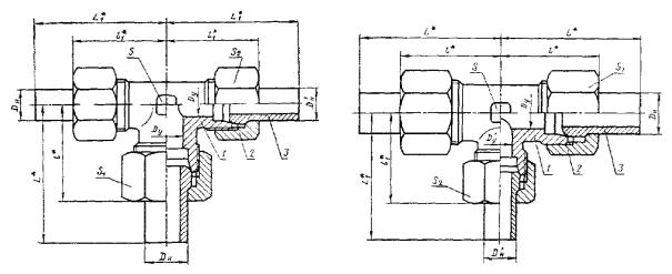 ___________ * Размеры для справок 1 - тройник по ГОСТ 21863-78; 2 - накидная гайка по ГОСТ 23353-78; 3 - шаровой ниппель по ГОСТ 23355-78 Размеры, мм