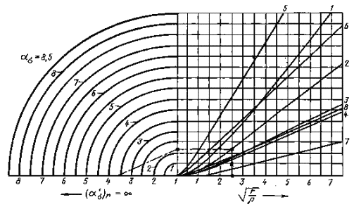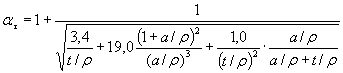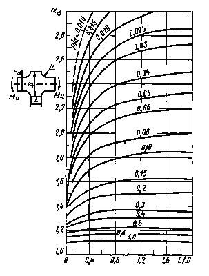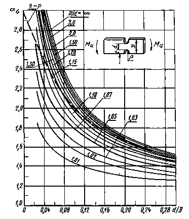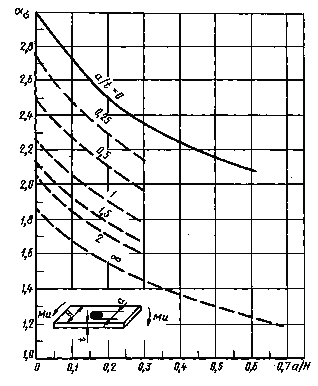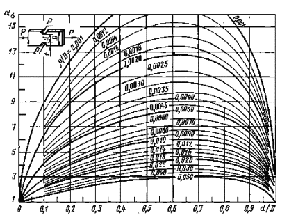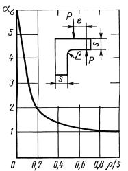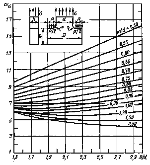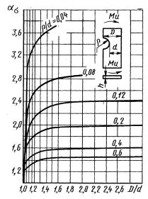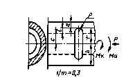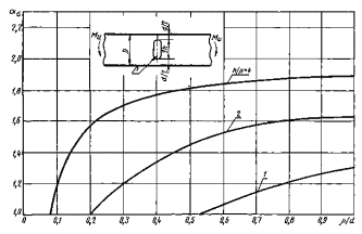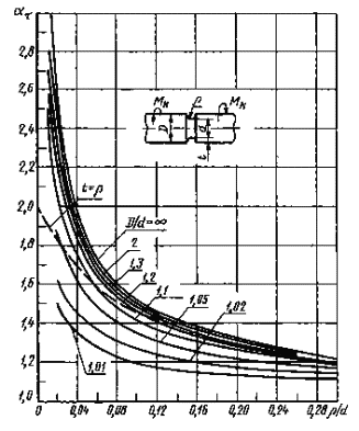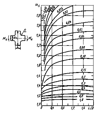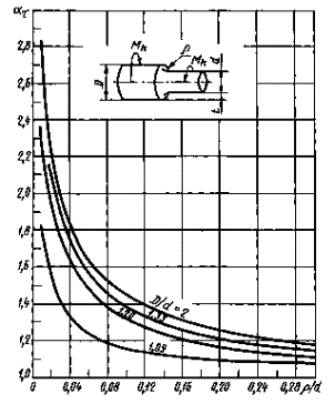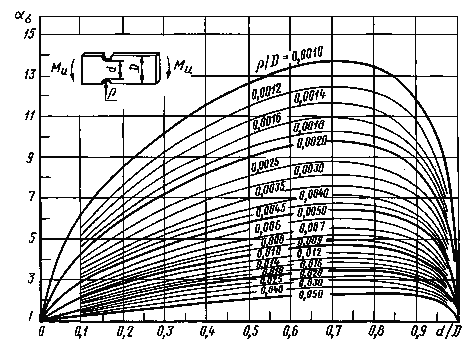 табл. 2, могут быть использованы также номограммы, приведенные на черт. 48 и 49 приложения 3. Примечания: 1. Пример использования номограмм для элементов с двусторонней внешней выточкой при изгибе. Дано: ρ = 2,5 мм; t = 15 мм; а = 95 мм. Находим Как вытекает из табл. 2, для 2. Пример использования номограммы для элементов с внешней выточкой и осевым отверстием при изгибе. Дано: ρ = 4 мм; а = 13 мм; t = 36 мм; r = 25 мм. Находим Как указано в примере 1 при Теперь переходим к черт. 49 и смещаемся вверх по вертикали при значении Таблица 2 Конструктивные случаи для определения теоретических