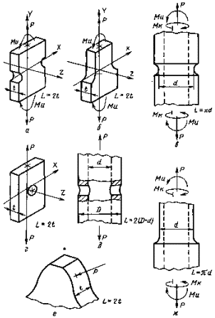 теоретических коэффициентов концентрации напряжений в деталях, изображенных в