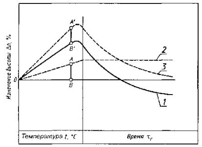 размеров во время нагревания и в период выдержки при постоянной температуре 1 - кривая для образца,