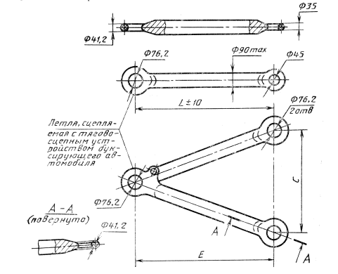 горизонтальной осью вращения, размеры петель, сцепляемых с буксирными вилками,