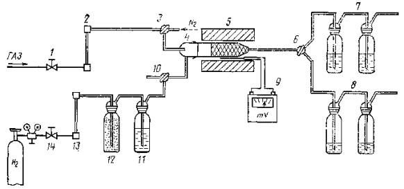 водой; 8 - склянки с поглотительным раствором; 9 - милливольтметр;