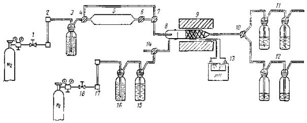 игольчатые вентили; 2, 17 - реометры; 3, 16 - склянки с