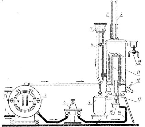 шланг газовой горелки; 15 - газовая горелка. водяной газовый счетчик с