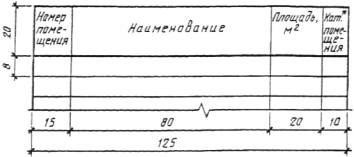 если нет соответствующих указаний на чертежах. 2.3.2. На планы этажей наносят: 1) координационные оси здания (сооружения); 2) размеры, определяющие расстояния между координационными осями и проемами, толщину стен и перегородок, другие необходимые размеры, отметки участков, расположенных на разных уровнях; 3) линии разрезов. Линии разрезов проводят, как правило, с таким расчетом, чтобы в разрез попадали проемы окон, наружных ворот и дверей; 4) позиции (марки) элементов здания (сооружения), заполнения проемов ворот и дверей (кроме входящих в состав щитовых перегородок), перемычек, лестниц и др. Допускается позиционное обозначение проемов ворот и дверей указывать в кружках диаметром 5 мм; 5) обозначения узлов и фрагментов планов; 6) наименования помещений (технологических участков), их площади, категории по взрывопожарной и пожарной опасности (кроме жилых зданий). Площади проставляют в нижнем правом углу помещения (технологического участка) и подчеркивают. Категории помещений (технологических участков) проставляют под их наименованием в прямоугольнике размером 5´8 (h) мм. Для жилых зданий, при необходимости, на планах указывают тип и площадь квартир. При этом площадь проставляют в виде дроби, в числителе которой указывают жилую площадь, в знаменателе - полезную. Допускается наименования помещений (технологических участков), их площади и категории приводить в экспликации по форме 2. В этом случае на планах вместо наименований помещений (технологических участков) проставляют их номера. Для жилых зданий экспликацию помещений, как правило, не выполняют; 7) границы зон передвижения технологических кранов (при необходимости). Форма 2 Экспликация помещений ________ * Категория по