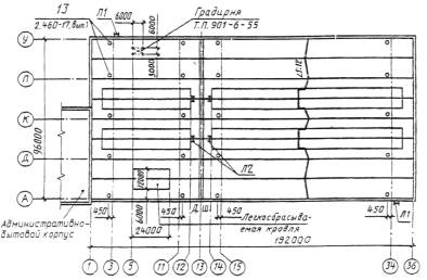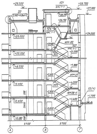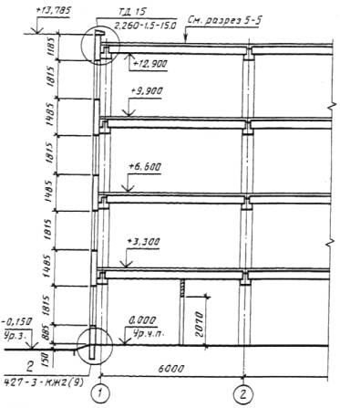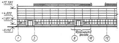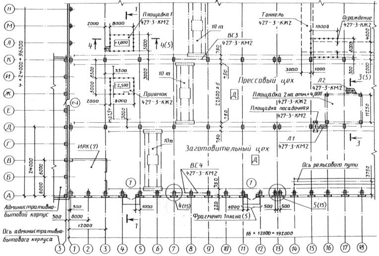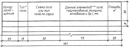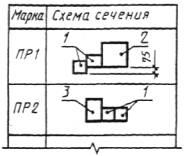 взрывопожарной и пожарной безопасности. 2.3.3. Встроенные помещения и другие участки здания (сооружения), на которые выполняют отдельные чертежи, изображают схематично сплошной тонкой линией с показом несущих конструкций. 2.3.4. Площадки, антресоли и другие конструкции, расположенные выше секущей плоскости, изображают схематично штрихпунктирной тонкой линией с двумя точками. 2.3.5. Примеры выполнения планов этажей здания приведены в приложении 2. 2.3.6. К планам этажей выполняют: 1) ведомость перемычек по форме 3. Примеры заполнения ведомости и спецификации элементов перемычек приведены в приложении 3; 2) спецификации заполнения элементов оконных, дверных и др. проемов, щитовых перегородок, перемычек, замаркированных на планах, разрезах и фасадах - по форме 7 или 8 приложения 7 ГОСТ 21.101. Пример выполнения спецификации элементов заполнения проемов приведен в приложении 3. Форма 3 Ведомость перемычек 2.4. Разрезы и фасады 2.4.1. Линии контуров элементов конструкций в разрезе изображают сплошной толстой основной линией, видимые линии контуров, не попадающие в плоскость сечения, - сплошной тонкой линией. 2.4.2. На разрезы и фасады наносят: 1) координационные оси здания (сооружения), проходящие в характерных местах разреза и фасада (крайние, у деформационных швов, несущих конструкций, в местах перепада высот и т. п.), с размерами, определяющими расстояния между ними (только на разрезах) и общее расстояние между крайними осями; 2) отметки, характеризующие расположение элементов несущих и ограждающих конструкций по высоте, 3) размеры и привязки по высоте проемов, отверстий, ниш и гнезд в стенах и перегородках, изображенных в разрезах; 4) позиции (марки) элементов здания (сооружения), не указанные на планах. На фасадах указывают также типы заполнения оконных проемов, материал отдельных участков стен, отличающихся от основных материалов. Допускается типы оконных проемов указывать на планах этажей; 5) обозначения узлов и фрагментов разрезов и фасадов. Примеры выполнения разрезов приведены в приложении 4, фасадов и их фрагментов - в приложении 5. 2.5. Планы полов и кровли (крыши) 2.5.1 На планы полов наносят: 1) координационные оси: крайние, у деформационных швов, по краям участков с различными конструктивными и другими особенностями и с размерными привязками таких участков; 2) обозначения уклонов полов; 3) тип полов. Обозначения типов полов проставляют в кружке диаметром 7 мм; 4) отметки в местах перепадов полов. Стены здания (сооружения) и перегородки на планах полов изображают одной сплошной толстой основной линией. На планах полов указывают элементы здания (сооружения) и устройства, влияющие на конструкцию пола (проемы ворот и дверей, деформационные швы, каналы, трапы и др.), границы участков с различной конструкцией пола. Деформационные швы изображают двумя тонкими сплошными линиями, границы участков пола - пунктирными линиями. 2.5.2. Планы полов допускается совмещать с планами этажей. 2.5.3. К планам полов составляют экспликацию полов по форме 4. Пример выполнения плана полов приведен в приложении 6. Форма 4 Экспликация полов __________ * Тип пола по рабочим