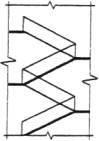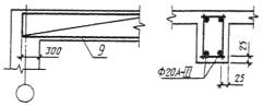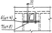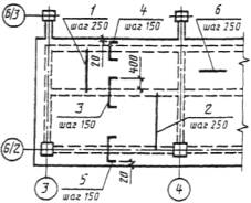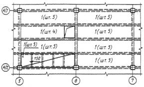 Черт. 4 4) на участках с отдельными стержнями, расположенными на равных расстояниях, изображают один стержень с указанием на полке-линии выноски его позиции, а под полкой линии-выноски - шаг стержней в соответствии с черт. 5. Если шаг стержней не нормируется, то рядом с обозначением стержней указывают в скобках число стержней в соответствии с черт. 6; 5) арматуру элементов, пересекающих изображаемый элемент, как правило, не указывают (черт. 8); 6) при изображении каркаса или сетки одинаковые стержни, расположенные на равных расстояниях, наносят только по концам каркаса или сетки, а также в местах изменения шага стержней. При этом под полкой линии-выноски с обозначением позиции стержня указывают их шаг в соответствии с черт. 7; 7) в сложной схеме армирования допускается позиции указывать у обоих концов одного и того же арматурного изделия или отдельного стержня в соответствии с черт. 8; 8) размеры гнутых стержней указывают по наружным, а хомутов - по внутренним граням в соответствии с черт. 9. Распределительную арматуру (поз. 6)