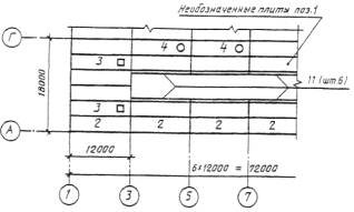 требованиях к схемам расположения элементов фундаментов. 4. Схема расположения ферм (балок). 5. Схема расположения панелей стен и перегородок. 3.3.3. Схему расположения выполняют в виде планов, фасадов или разрезов соответствующих конструкций, с упрощенным изображением элементов. 3.3.4. На схему расположения наносят: 1) координационные оси здания (сооружения), размеры, определяющие расстояния между ними и между крайними осями, размерную привязку осей или поверхностей элементов конструкций к координационным осям здания (сооружения) или, в необходимых случаях, к другим элементам конструкций, другие необходимые размеры; 2) отметки наиболее характерных уровней элементов конструкций; 3) позиции (марки) элементов конструкций; 4) обозначения узлов и фрагментов; 5) данные о допустимых монтажных нагрузках. 3.3.5. Одинаковые позиции (марки) последовательно расположенных элементов конструкций на схеме расположения, допускается наносить только по концам ряда с указанием количества позиций. 3.3.6. Схему расположения панелей стен при многоярусном расположении панелей в пределах этажа выполняют в плоскости стен на виде, при однородном расположении - в плане. 3.3.7 В наименовании схем расположения, при необходимости, приводят сведения, определяющие положение конструкции в здании (сооружении). Допускается схемам расположения присваивать порядковые номера. Пример: Схема расположения элементов перекрытия на отм. 7,200 между осями 1 - 15, В - Г (схема 1). 3.3.8. На схеме расположения наносят метки для установки в проектное положение элементов конструкций, имеющих несимметричное расположение закладных изделий и другие отличительные признаки. Примеры выполнения схем расположения элементов сборных конструкций приведены в приложении 10. 3.3.9 Если монолитная железобетонная конструкция состоит из нескольких элементов (балок, плит и др.), на каждый из которых выполняют отдельные схемы армирования, то этим элементам присваивают позиционные обозначения или марки в соответствии с черт. 1. Черт. 1 3.3.10. В технических требованиях к схеме расположения, при необходимости, приводят указания о порядке монтажа, замоноличивания швов, требования к монтажным соединениям. 3.3.11. Рабочие чертежи арматурных и закладных изделий, разработанные для монолитных железобетонных конструкций в качестве самостоятельных документов, в состав основного комплекта рабочих чертежей не включают, а записывают в ведомость ссылочных и прилагаемых документов в раздел «Прилагаемые документы». 3.3.12. На схему армирования монолитной железобетонной конструкции наносят: 1) координационные оси здания (сооружения); 2) контуры конструкций - сплошной толстой основной линией; 3) размеры, определяющие положение арматурных и закладных изделий и толщину защитного слоя бетона. Арматурные и закладные изделия на схеме изображают очень толстой сплошной линией. При необходимости на схеме указывают фиксаторы для обеспечения проектного положения арматуры. 3.3.13. На схеме армирования применяют следующие упрощения: 1) каркасы и сетки изображают контуром в соответствии с черт. 2; 2) для обеспечения правильной установки в проектное положение несимметричных каркасов и сеток указывают только их характерные особенности, (диаметр отличающихся по диаметрам стержней и др.) в соответствии с черт. 3; 3) если железобетонная конструкци