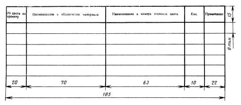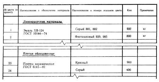 Постановлением Государственного комитета СССР по делам строительства от 2 апреля 1981 г. № 48 срок введения установлен с 01.01.82 Несоблюдение стандарта преследуется по закону 1. Настоящий стандарт устанавливает состав и правила оформления рабочих чертежей архитектурных решений интерьеров производственных и вспомогательных здании всех отраслей промышленности и народного хозяйства. Стандарт полностью соответствует СТ СЭВ 4410-83. (Измененная редакция, Изм. № 1). 2. Необходимость разработки рабочих чертежей архитектурных решений интерьеров устанавливается заданием на проектирование. 3. Рабочие чертежи архитектурных решений интерьеров выполняют в соответствии с требованиями настоящего стандарта и других стандартов системы проектной документации для строительства. 4. В состав рабочих чертежей архитектурных решений интерьеров включают: рабочие чертежи, предназначенные для выполнения отделочных работ внутри здания (основной комплект рабочих чертежей марки АИ); чертежи элементов интерьеров, не вошедших в состав рабочих чертежей других марок; ведомость потребности в материалах; образцы колеров (при отсутствии номеров цвета по картотеке цветовых эталонов в стандартах или ТУ). 5. В состав основного комплекта рабочих чертежей марки АИ, как правило, включают: общие данные по рабочим чертежам; планы этажей здания; виды и развертки внутренних поверхностей стен; планы полов и потолков; фрагменты планов, видов и разверток; шаблоны; схемы технологических и санитарно-технических коммуникаций с опознавательной и сигнально-предупреждающей окраской; ведомость отделки помещений; спецификацию. Состав основного комплекта может быть уточнен в зависимости от особенностей интерьеров. 6. Общие данные по рабочим чертежам выполняют по ГОСТ 21.102-79. В состав общих данных по рабочим чертежам в дополнение к данным, предусмотренным ГОСТ 21.102-79, включают ведомость отделочных и лакокрасочных материалов и, при необходимости, указания по отделочным работам. 7. Ведомость отделочных и лакокрасочных материалов составляют по форме, приведенной на черт. 1. В графах ведомости указывают: а) в графе «№ цвета по проекту» - порядовый номер цвета, принятый в рабочих чертежах марки АИ; б) в графе «Наименование и обозначение материала» - наименование отделочного или лакокрасочного материала, его марку или тип по стандарту или ТУ и обозначение стандарта или ТУ; в) в графе «Наименование и номера эталонов цвета» - принятое по стандарту или ТУ наименование цвета отделочного или лакокрасочного материала и его номер по картотеке цветовых эталонов. При отсутствии номера цвета по картотеке цветовых эталонов в стандартах или ТУ номер цвета в графе не проставляют; г) в графе «Кол.» - количество отделочных или лакокрасочных материалов каждого цвета; д) в графе «Примечание» - дополнительные данные, например, единицы измерения, если они приняты не в штуках; ссылка на альбом образцов колеров. Ведомость отделочных и лакокрасочных материалов Черт. 1 Запись отделочных и лакокрасочных материалов в ведомости производят по разделам, соответствующим различным видам материалов. Наименование разделов записывают в графу «Наименование и обозначение материала» в виде заголовков и подчеркивают. Пример заполнения ведомости отделочных и лакокрасочных материалов приведен на черт. 2. Ведомость о