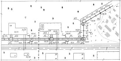 сооружениями, влияющими на прокладку проектируемых сетей. Величины отметок и длины участков сетей указывают в
