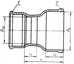 Примечание. Размеры и масса даны без учета антикоррозионного покрытия. 1 - раструб типа I по ГОСТ 6942.2-80; 2 - хвостовик по ГОСТ 6942.2-80 Пример условного обозначения переходного патрубка Dy = 50 мм и Dy = 100 мм: Патрубок